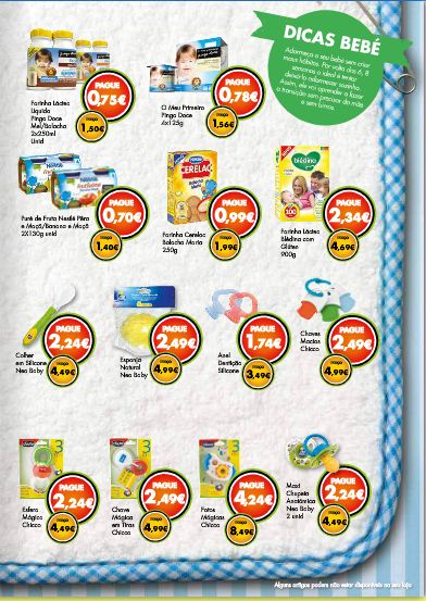 A promoção inclui produtos de higiene pessoal feminina, champô, iogurtes, gelados, fraldas, papas, chuchas, brinquedos, cremes bebé, toalhitas, toalhitas húmidas, pastelaria de criança, bolachas, douradinhos, pasta de dentes, e muitos outros produtos!